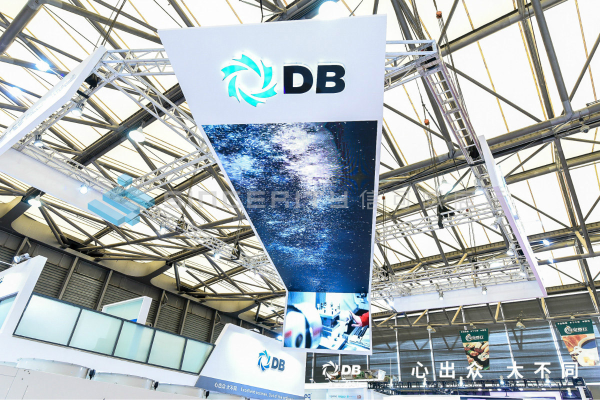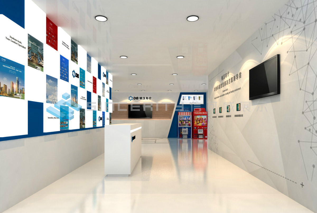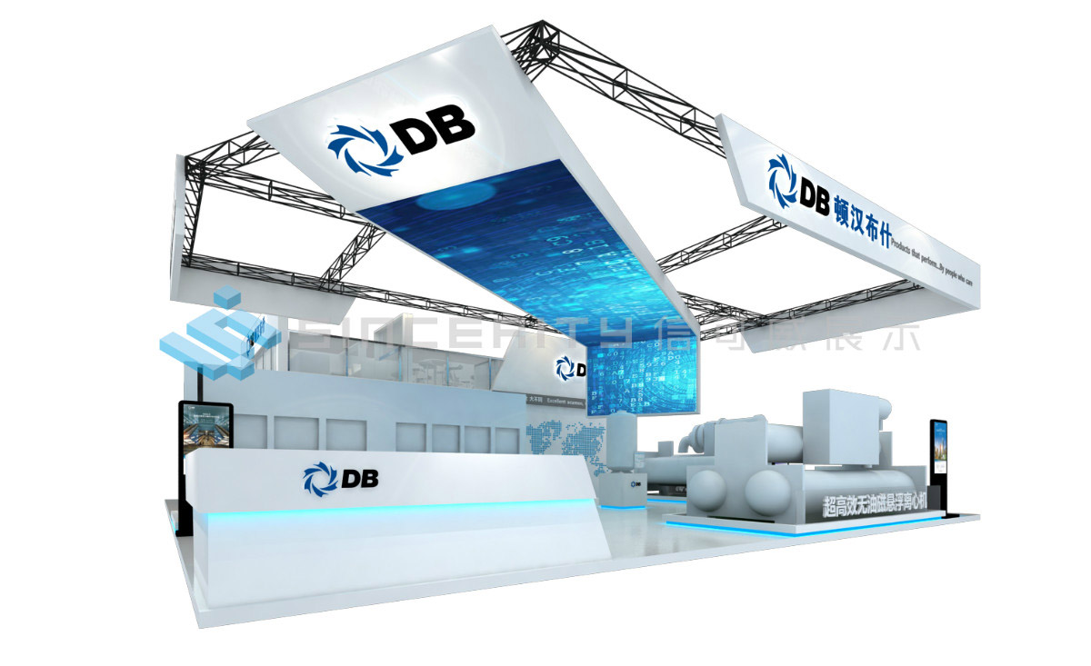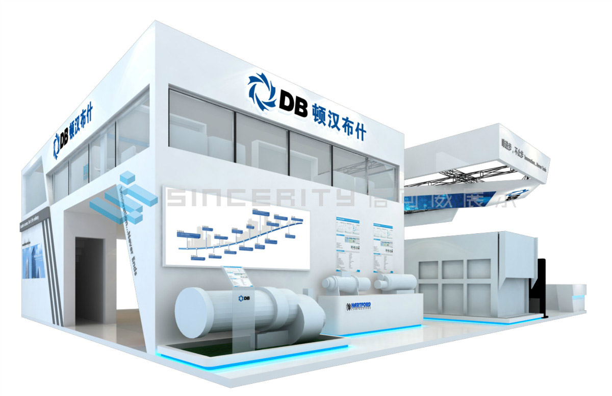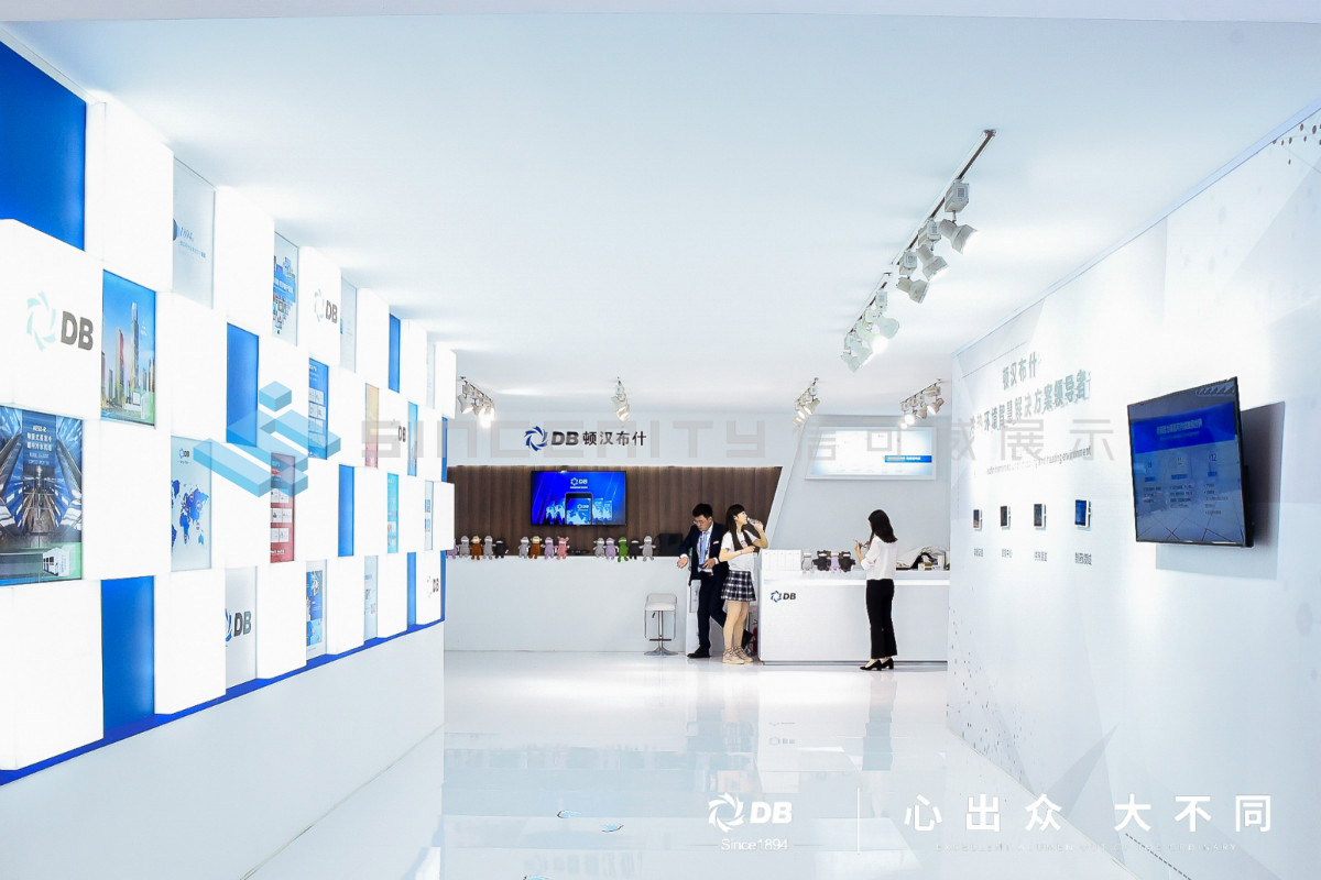 DB頓漢布什展臺設(shè)計(jì)以白為主色,藍(lán)色為輔色,展臺中央采用高科技折屏,著重突出DB品牌和產(chǎn)品的展示,契合DB全球品牌戰(zhàn)略的輸出,將情懷與科技融為一體。
